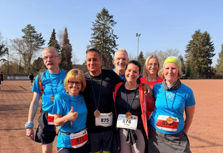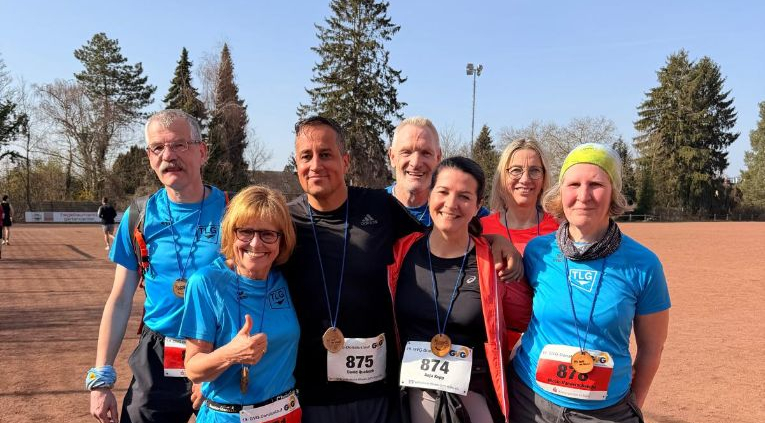 Um 11.00 Uhr fiel der Startschuss auf dem Sportgelände des SC Fortuna Liblar für die Halbmarathonis. Ca. 199 Höhenmeter führten über Waldwege vorbei am Franziskussee, Untersee und Donatussee. Auf der zweifach zu umrundenden Strecke, mit vielen Streckenposten und wegweisenden Schildern wurden Getränke bei den steigenden Temperaturen an den Verpflegungspunkten gerne in Anspruch genommen. Nach dem letzten Anstieg kurz vor dem Ziel erreichte Jürgen Axmacher das Ziel nach 1:57:15 h, belegte den 3. Platz der AK M60, gefolgt von Christiana Lange nach 2:06:16 h, Platz 1der AK W65, Udo Lütkeduhme erreichte in der AK M65 den 5. Platz nach2:44:11 h, knapp danach kam Nicole Vanderschaeghe nach 2:44:25 h ins Ziel auf dem Sportgelände und erreichte den 8. Platz in der AK W50.