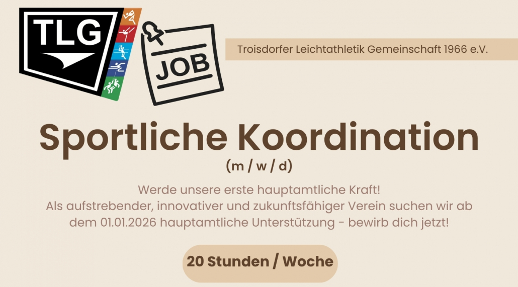 Die Troisdorfer Leichtathletik Gemeinschaft (TLG) ist ein aufstrebender, innovativer und zukunftsorientierter Sportverein mit einem starken Fokus auf Nachwuchsförderung, Gemeinschaft und Bewegung. Zur Verstärkung unseres Teams suchen wir zum 01.01.2026 eine engagierte hauptamtliche Kraft (m/w/d), die uns in der Organisation undWeiterentwicklung unseres Vereins unterstützt. Die Wochenarbeitszeit beträgt 20 Stunden, die flexibel und teilweise im mobilen Arbeiten absolviert werden können.