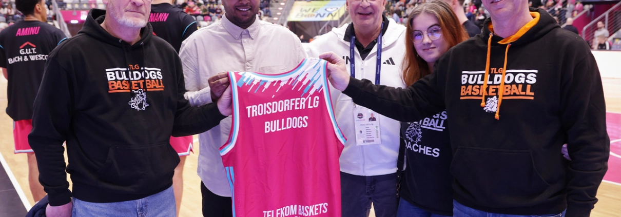 Baskets-Profis gegen die SKYLINERS Frankfurt am 10.12.25 wurden die Troisdorfer LG Bulldogs offiziell im Telekom Dome als neuer Partner vorgestellt.