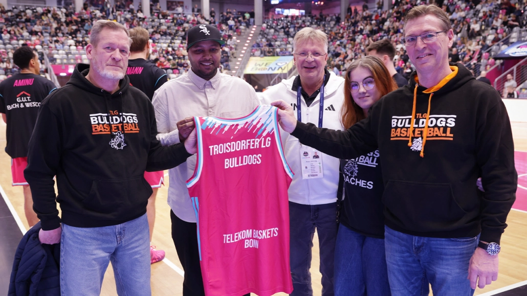 Baskets-Profis gegen die SKYLINERS Frankfurt am 10.12.25 wurden die Troisdorfer LG Bulldogs offiziell im Telekom Dome als neuer Partner vorgestellt.