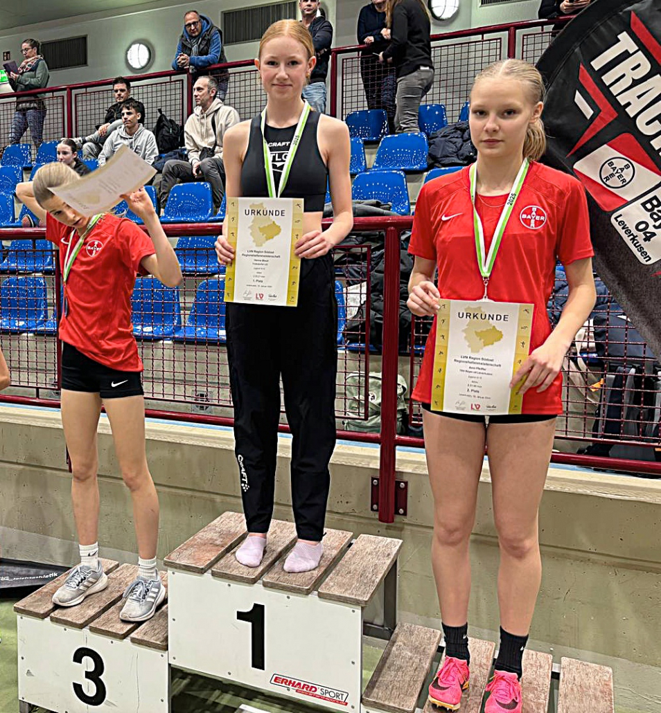 Die Hallen-Regionsmeisterschaften gehören zu den ersten Höhepunkten des neuen Jahres in der Leichtathletik. Gut vorbereitet sahen sich die U14 und U16 Athleten und Athletinnen der Troisdorfer LG am vergangenen Sonntag einer starken Konkurrenz in der Leichtathletik-Halle in Leverkusen-Manfort gegenüber. Den Anfang machte Justus Löbach, der verletzungsbedingt mit Trainingsrückstand in das Meisterschaftsrennen einstieg. Mit Jakob Fiehler (LAV 23 Meckenheim) und dem Lokalmatador Henri Parpart (TSV Bayer 04 Leverkusen) hatte er es direkt mit zwei starken Mittelstrecken-Experten in der Altersklasse M14 zu tun. Die drei sollten das Meisterschaftsrennen unter sich ausmachen. Justus lief ein beherztes und mutiges Rennen, konnte das hohe Tempo seiner Widersacher aber leider nicht ganz mitgehen, die im Ziel jeweils mit Bestleistungen aufwarten konnten. Am Ende stand mit 2:22,55 min. für ihn ein hervorragender dritter Platz zu buche, über den er sich freuen konnte. Als nächstes ging mit Emma Schätzle eine W14 Debütantin über die 4 Runden auf der 200m Kurzbahn. Um sie bestens vorzubereiten hatte Emma genaue Vorgaben von Trainer Thorsten für das Rennen erhalten. Nach dem Startschuss hielt sich das neueste Mitglied des TLG- Mittelstreckenteams zunächst etwas zurück, ging aber mutig das Tempo der Spitzengruppe mit. Erst eingangs der letzten Runde forcierte Emma das Tempo und lief hinter Irle Marla (Pulheimer SC) und Johanna Schauen (TSV Bayer 04 Leverkusen) völlig überraschend als dritte in 2:44,94 min. ins Ziel. Für den Abschluss des Wettkampftages sorgte Mittelstrecken-Talent Hanna Block in der Altersklasse W15. Auch Hanna hatte es mit starken Gegnerinnen vom TSV Bayer 04 Leverkusen und LAZ Rhein-Sieg zu tun. Hanna lief ein taktisch überragendes Rennen und hielt sich zunächst zurück. Eingepfercht zwischen ihren Gegnerinnen ging sie das Tempo mit und übernahm in der letzten Runde souverän die Führung, die sie bis zum Ziel nicht mehr abgab. Ihre Zielzeit von 2:30,21 min bedeutete nicht nur den Regio-Meistertitel sondern auch eine neue persönliche Bestzeit. Weitere Ergebnisse: Moses Babernt 800m in 2:49,19 min. (11. M14), Jussi Mühlhausen 800m in 2:54,69 min. (8. M12)